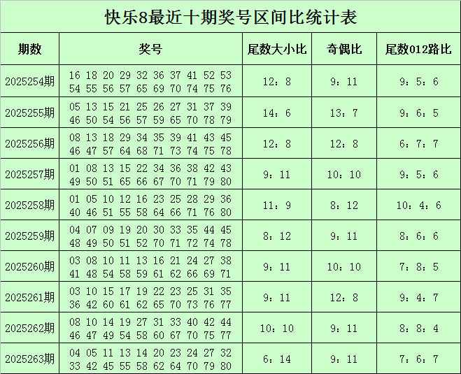福彩舒适8第2025263期开奖记忆:04 05 11 13 14 20 23 24 27 32 33 42 45 55 58 62 64 70 79 80,其中奖号余数奇偶比为9:11,余数大小比为6:14,余数012路比为7:6:7。
