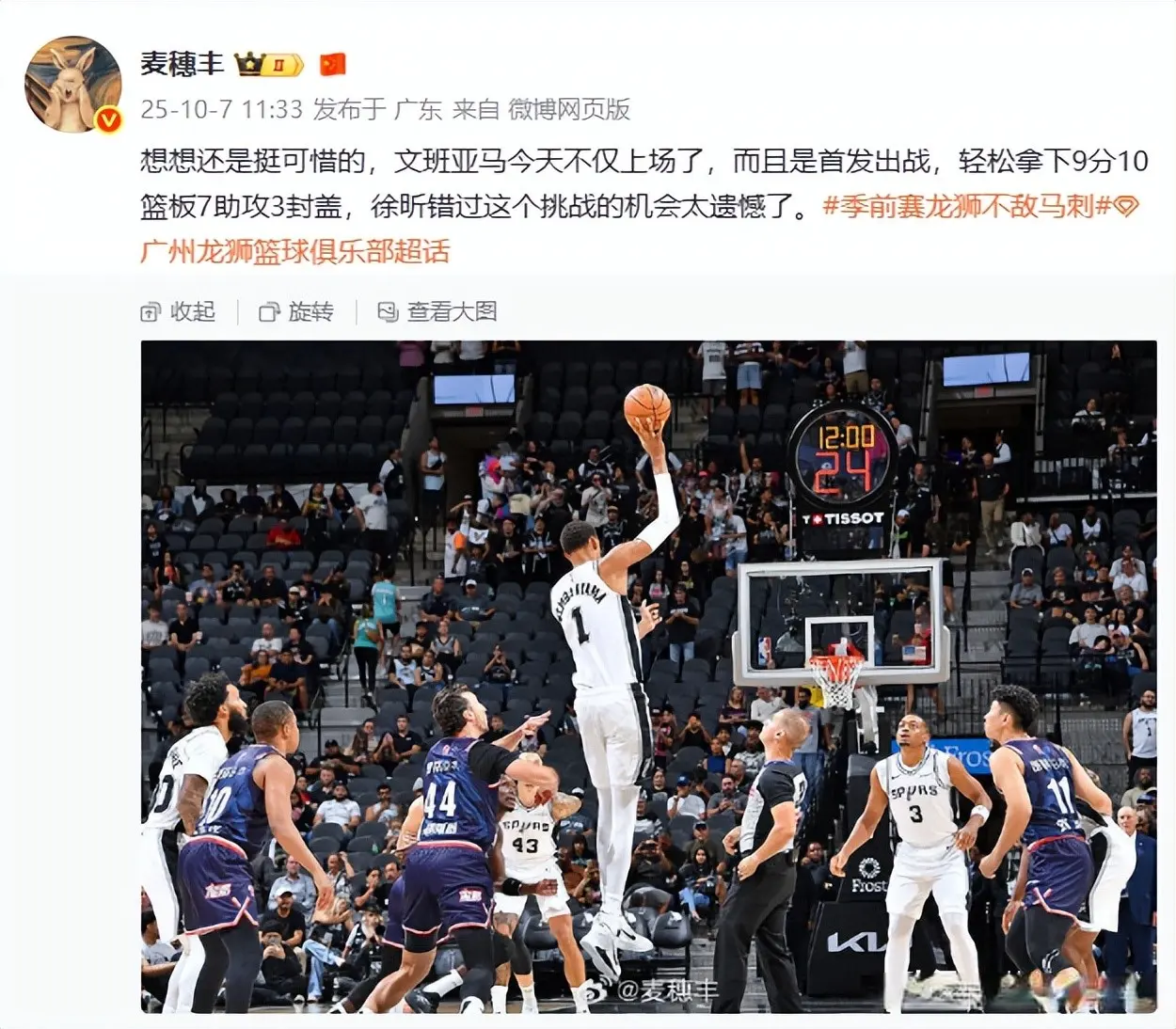 NBA季前赛火热进行中,备受瞩蓄意广州男篮迎来了第一场比赛,效果以88-119不敌马刺队,际遇开门黑。比输球更叫东谈主感到戚然的是,有着“文班亚昕”好意思誉的徐昕并未跟班广州男篮去开辟NBA季前赛体育集锦,使得他错过了挑战文班亚马的良机,以致于广东名记麦穗丰老诚皆公开为徐昕感到戚然了:的确太缺憾了。
