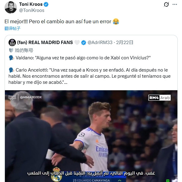 直播吧02月24日讯安切洛蒂近日进入节目继承巴尔达诺采访,以克罗斯为例,谈到了阿隆索此前与维尼修斯的打破。克罗斯社媒转发簸弄。