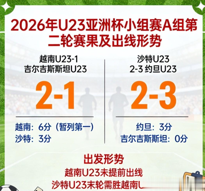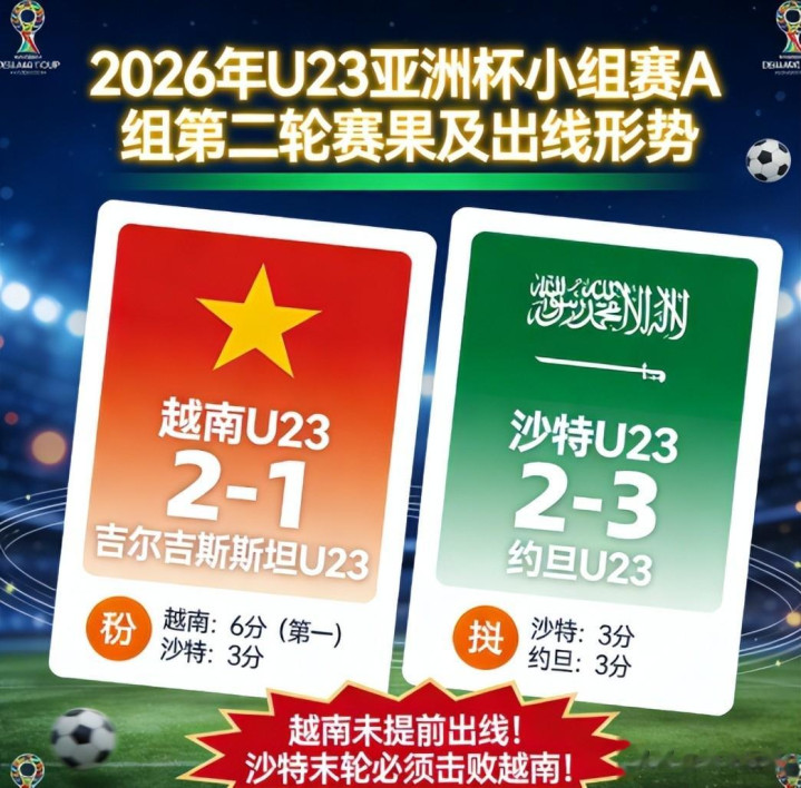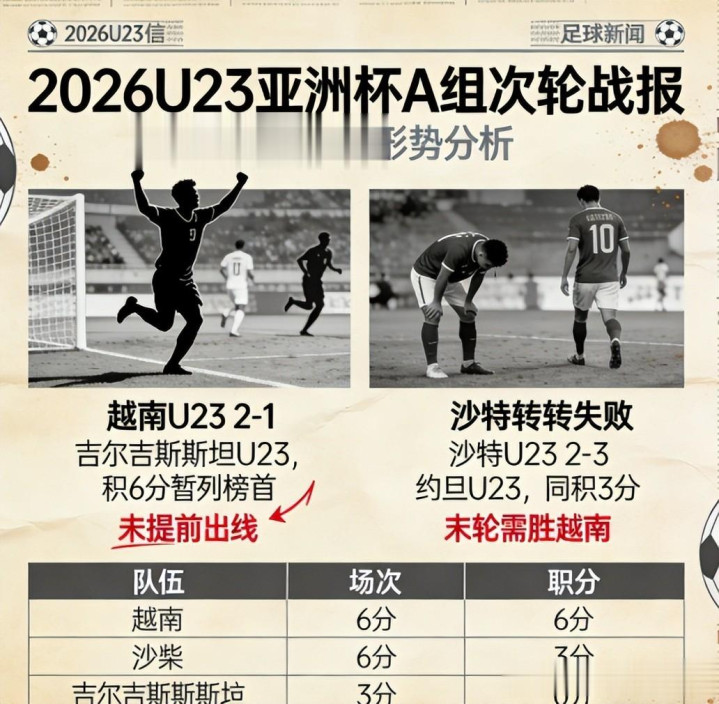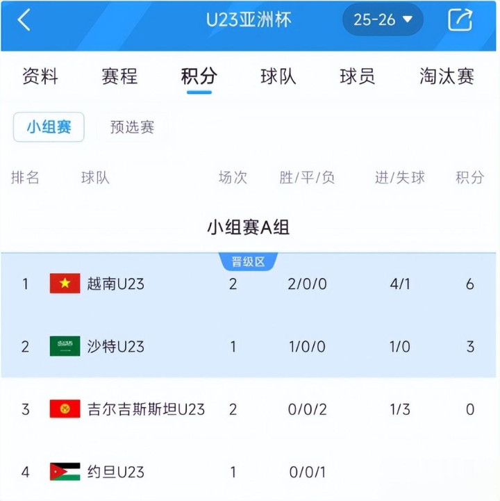 两轮罢了,A组积分就变得很高明:越南6分第一,沙特3分,约旦3分,吉尔吉斯斯坦0分。