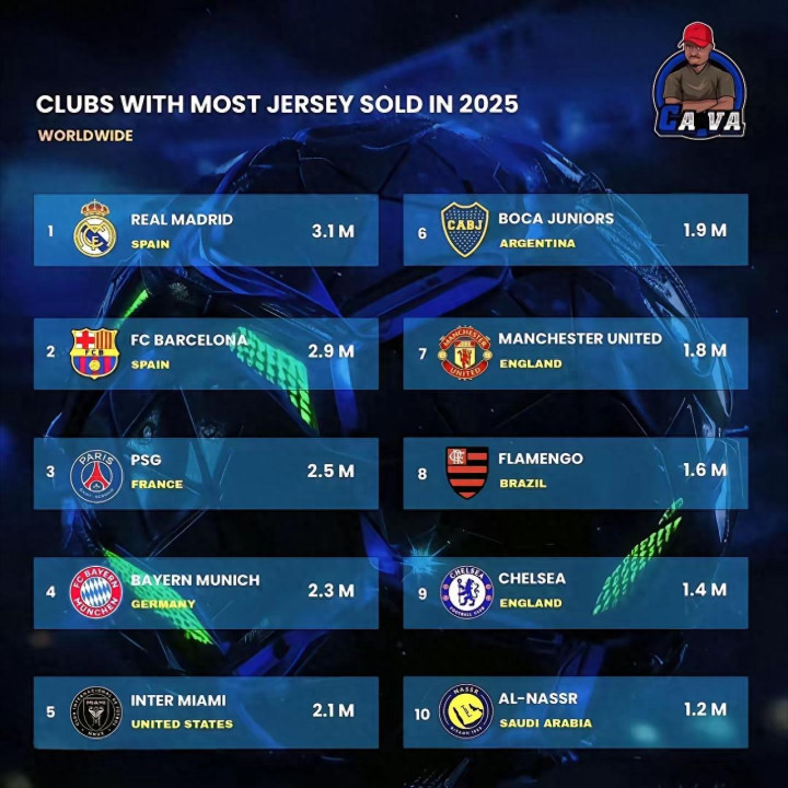 2025年也曾由去,2026年也曾降临。那么问题来了,2025年足坛哪家俱乐部的球衣卖得最佳?皇萨依然稳居前二,三冠王巴黎第三,拜仁第四,而梅西让迈阿密海外的球衣销量平直高涨40%,飙升至第五,C罗方位的利雅得得胜仅排行第十。