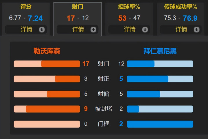 全场比赛体育最新信息,勒沃库森的控球率为53%,一共有17次射门,但仅有3次射正;拜仁一共有12次射门,其中5次射正。